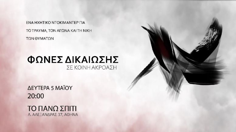 Ώρα προσέλευσης: 19.30 / Έναρξη 20.00 Είσοδος Ελεύθερη – Στον χώρο θα υπάρχει δυνατότητα ελεύθερης συνεισφοράς Το Πάνω Σπίτι (Λ. Αλεξάνδρας 37, Αθήνα) Οι Φωνές Δικαίωσης, το ηχητικό ντοκιμαντέρ που διακρίθηκε στο 27ο Φεστιβάλ Ντοκιμαντέρ Θεσσαλονίκης με Ειδική Μνεία φέρνοντας στο προσκήνιο την υπόθεση χρόνιας κακοποίησης ανήλικων αθλητριών από προπονητή Ταεκβοντό στην Ηλιούπολη, παρουσιάζεται για πρώτη φορά δημόσια σε μία κοινή ακρόαση που θα πραγματοποιηθεί Δευτέρα […]