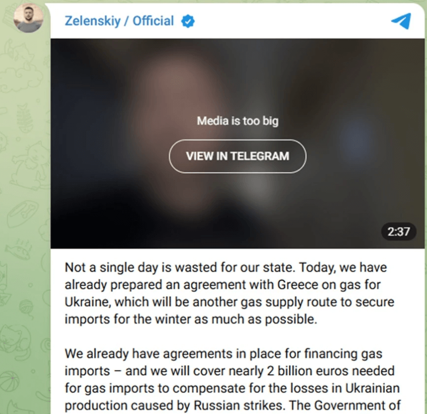 «Σήμερα, έχουμε ετοιμάσει ήδη μια συμφωνία με την Ελλάδα για φυσικό αέριο για την Ουκρανία, η οποία θα αποτελέσει μια ακόμη διαδρομή εφοδιασμού με φυσικό αέριο που θα εξασφαλίσει τις εισαγωγές για τον χειμώνα όσο το δυνατόν περισσότερο», αναφέρει στην εφαρμογή ανταλλαγής μηνυμάτων Telegram ο Ουκρανός Πρόεδρος.