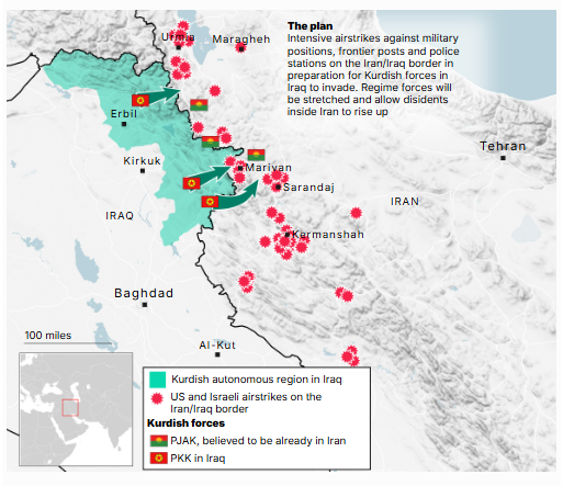 Τα τελευταία 24ωρα έχουν ενταθεί οι παρασκηνιακές επαφές των κυβερνήσεων Τραμπ και Νετανιάχου με τους Κούρδους μαχητές, εκτιμώντας πως θα μπορούσαν να αποδειχθούν κομβικοί στις εξελίξεις, αυξάνοντας την πίεση στο καθεστώς και ενθαρρύνοντας μια εσωτερική εξέγερση και σε άλλες περιοχές του Ιράν. Βάσει των σχεδιασμών, θα συμβάλουν στη δημιουργία χάους και στη διάσπαση στρατιωτικών πόρων του Ιράν, αναγκάζοντας το καθεστώς να αναπτύξει στρατεύματα σε πολλαπλά μέτωπα.