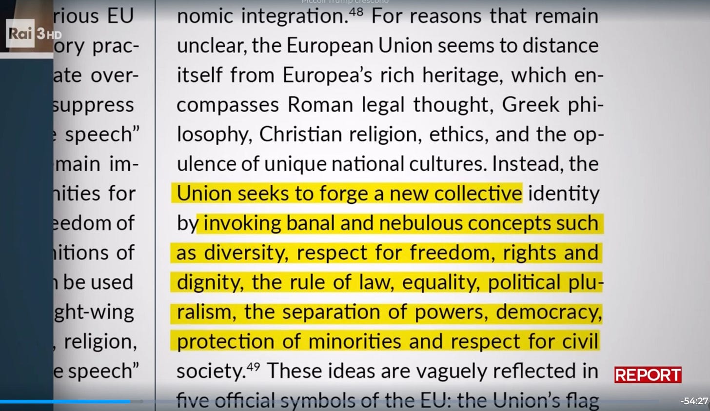 Αποσπάσματα από το The Great Reset που παρουσιάστηκε από το Report - Τον Μάρτιο η Meloni εξαπέλυσε από το βήμα της Βουλής δριμεία επίθεση κατά του Μανιφέστο του Ventotene (“κομμουνιστικό”, “δεν ξέρω αν αυτή είναι η Ευρώπη σας, σίγουρα δεν είναι η δική μου”), ήταν η πρώτη φορά που το έκανε, ενώ στο παρελθόν είχε επικρίνει τον Renzi ότι πρόδιδε τις αρχές του Μανιφέστου… Η έρευνα του Report διαπίστωσε πως πολλά από όσα υποστήριξε η Ιταλίδα πρωθυπουργός, οι ίδιες οι εκφράσεις της για το Ventotene, “εμπνέονται” από ένα πολυσέλιδο κείμενο “μεταρρύθμισης” της Ε.Ε., που είχε κυκλοφορήσει μόλις λίγες μέρες νωρίτερα υπό τον τίτλο “The Great Reset: Restoring Member State Sovereignty in the European Union” και έχει συνταχθεί από το Ordo Iuris, ινστιτούτο που συνδέεται με το υπερσυντηρητικό πολωνικό κόμμα PiS και το Mathias Corvinus Collegium/MCC, ουγγρικό ίδρυμα στο οποίο το Report αναφέρει πως η κυβέρνηση Orbán έχει παραχωρήσει asset εκατοντάδων εκατομμυρίων. Στο Great Reset παραλληλίζεται το Μανιφέστο του Ventotene, πυλώνας μιας ομοσπονδιακής Ευρώπης, με το Μανιφέστο των Marx-Engels και, στο τέλος, υπάρχουν προτάσεις για διάλυση της Ευρωπαϊκής Ένωσης… Η Ε.Ε. έχει γίνει ένα τυραννικό καθεστώς, που με ύπουλο τρόπο επιχείρησε να επιβάλλει στα επιμέρους κράτη “μια νέα συλλογική ταυτότητα, επικαλούμενη κοινότοπες και ασαφείς έννοιες όπως η διαφορετικότητα, η ελευθερία, ο σεβασμός του κράτους δικαίου, η ισότητα, η διάκριση των εξουσιών, η δημοκρατία, ο σεβασμός προς τις μειονότητες και την κοινωνία των πολιτών”, γράφει, αξίες που η Ευρωπαϊκή Ένωση προσπάθησε να επιβάλει πρωτίστως μέσω των διαδικασιών παράβασης που εφάρμοσε σε Πολωνία και Ουγγαρία, όταν οι κυβερνήσεις εθνικής κυριαρχίας θέσπισαν νόμους που περιόριζαν την ανεξαρτησία της Δικαιοσύνης και προέβλεπαν διακρίσεις εις βάρος των γυναικών και των ομοφυλόφιλων. Ο πρόεδρος του ινστιτούτου Ordo Iuris, Jerzy Kwaśniewsky δήλωσε στο Report πως το κείμενο είχε σταλεί σε όλους τους πρωθυπουργούς, ο δε εκπρόσωπος τύπου είπε πως το περιεχόμενο είχε κοινοποιηθεί πριν τη δημοσίευση στο Centro Studi Macchiavelli, το think tank της Lega του Salvini. Ο Kwaśniewsky δήλωσε πως στις προπαρασκευαστικές συζητήσεις για το πολυσέλιδο κείμενο συμμετείχε και ο 33χρονος Francesco Giubilei, του think tank των Fratelli d’Italia/FdI, Nazione Futura ο οποίος είναι επίσης επιστημονικός διευθυντής της Fondazione Alleanza Nazionale, του θησαυροφυλακίου του κόμματος της Meloni και δεν θέλησε να προβεί σε κανένα σχολιασμό προς το Report. Ο Rodrigo Ballester, επικεφαλής του Κέντρου Ευρωπαϊκών Σπουδών Mathias Corvinus Collegium σχολίασε στο Report πως “σκοπός μας είναι να επιτρέψουμε σε κάθε κράτος μέλος να αποφασίζει μόνο του, να είναι συντηρητικό όποτε επιθυμεί. Το όνειρό μου είναι μια Ευρωπαϊκή Ένωση ουδέτερη”, είπε. Η πρώτη πρόταση του Great Reset είναι η επιστροφή της Ευρώπης στο μοντέλο του 1957, να δημιουργηθεί μια Ευρωπαϊκή Ένωση των Εθνών χωρίς μια σημαία, έναν ύμνο, ένα κοινό νόμισμα. Η Ευρώπη, δήλωσε στο Report ο πρόεδρος του ινστιτούτου Ordo Iuris, Jerzy Kwaśniewsky, “δεν θα έπρεπε να προσπαθεί να δημιουργήσει μια νέα μορφή υπηκοότητας ή μια νέα ευρωπαϊκή πολιτιστική ταυτότητα. Είναι μια προσπάθεια καταδικασμένη σε αποτυχία, γιατί αντιβαίνει στη φυσική ταυτότητα των εθνικών κρατών”.