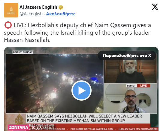 Ο Ναΐμ Κασέμ τόνισε ότι «η Χεζμπολάχ έχασε έναν αδερφό, έναν φίλο, έναν πατέρα και έναν ηγέτη», ωστόσο ξεκαθάρισε ότι παρά την απώλεια του Νασράλα και άλλων διοικητών, η ομάδα συνεχίζει την πορεία της κατά του Ισραήλ.