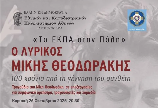 Με δύο επετειακές συναυλίες για τη συμπλήρωση των 100 χρόνων από τη γέννηση του Μίκη Θεοδωράκη και του Μάνου Χατζιδάκι, συνεχίζονται μέχρι τον Δεκέμβριο, οι επιμορφωτικές, πολιτιστικές και καλλιτεχνικές δράσεις, που πραγματοποιούν από κοινού ο Δήμος Αθηναίων, το Εθνικό και το Καποδιστριακό Πανεπιστήμιο Αθηνών, υπό τον τίτλο «Το ΕΚΠΑ στην Πόλη».