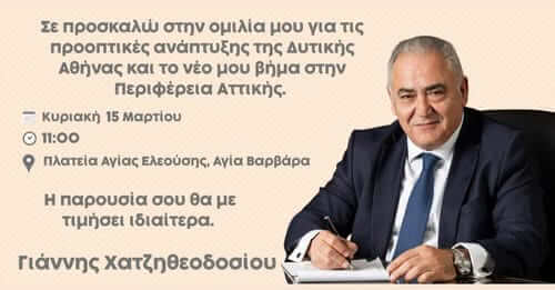 «Στην Αγία Βαρβάρα, στον τόπο που μεγάλωσα και έκανα τα πρώτα μου βήματα στην τοπική αυτοδιοίκηση, σας καλώ την Κυριακή 15 Μαρτίου, στις 11:00 το πρωί, στην Πλατεία Αγίας Ελεούσης, στην ομιλία μου για τις προοπτικές ανάπτυξης της Δυτικής Αθήνας και το νέο μου βήμα στην Περιφέρεια Αττικής. Σε αυτήν την πορεία θα προχωρήσουμε μαζί».