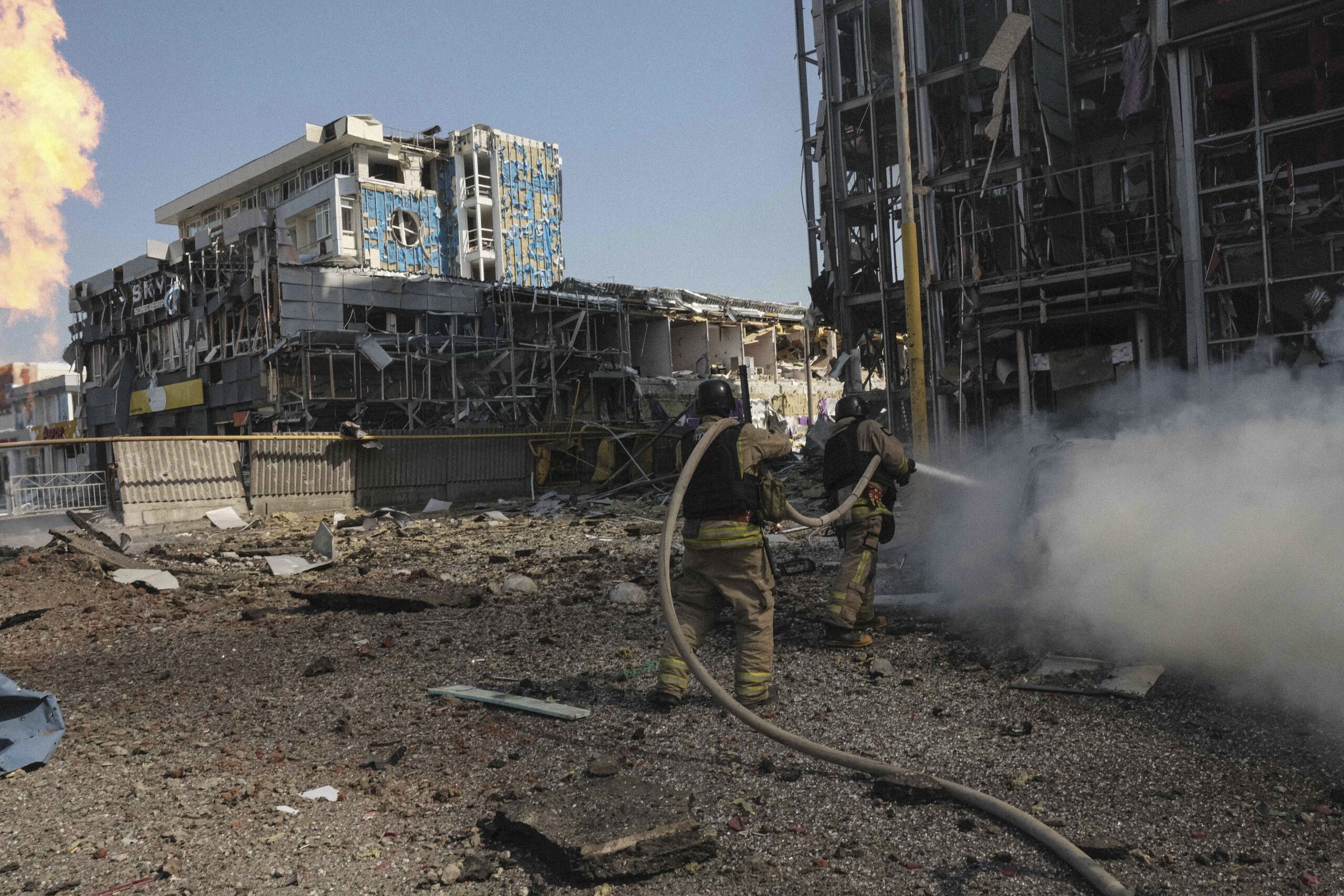 Βίντεο που δημοσιοποιήθηκαν σε πλατφόρμες κοινωνικής δικτύωσης δείχνουν τη βομβαρδισμένη περιοχή γύρω από το εμπορικό κέντρο, όπου ξέσπασε πυρκαγιά.