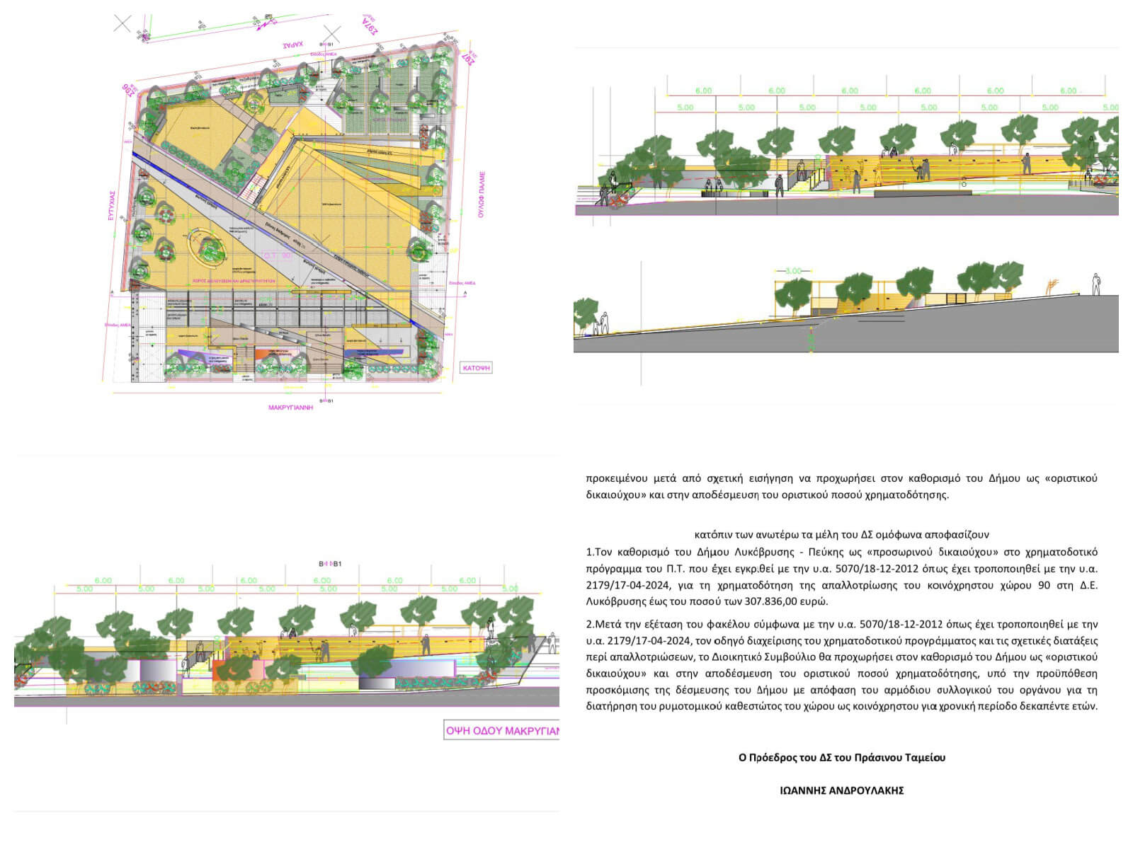 Με απόφαση του Πράσινου Ταμείου, εγκρίνεται η χρηματοδότηση 307.836,00 € για την εξαγορά του τελευταίου τρίτου της πλατείας Α. Παπανδρέου στη Λυκόβρυση και ως εκ τούτου, ο Δήμος Λυκόβρυσης-Πεύκης ορίζεται ως «προσωρινός δικαιούχος» της πλατείας. Ήδη έχουν εκπονηθεί οι τοπογραφικές και αρχιτεκτονικές μελέτες και ο Δήμος βρίσκεται πλέον ένα βήμα πριν από την απόκτηση της πλήρους κυριότητας.