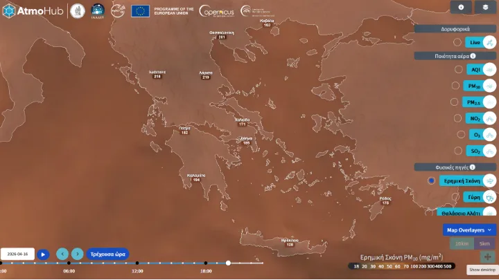 Συνεχίζεται η επίδραση του φαινομένου μεταφοράς σκόνης στη χώρα που έχει καλύψει το σύνολο της επικράτειας, όπως αναφέρει σε σχετική ενημέρωση ο κόμβος πληροφόρησης για την ατμοσφαιρική σύσταση στην Ελλάδα, AtmoHub.
